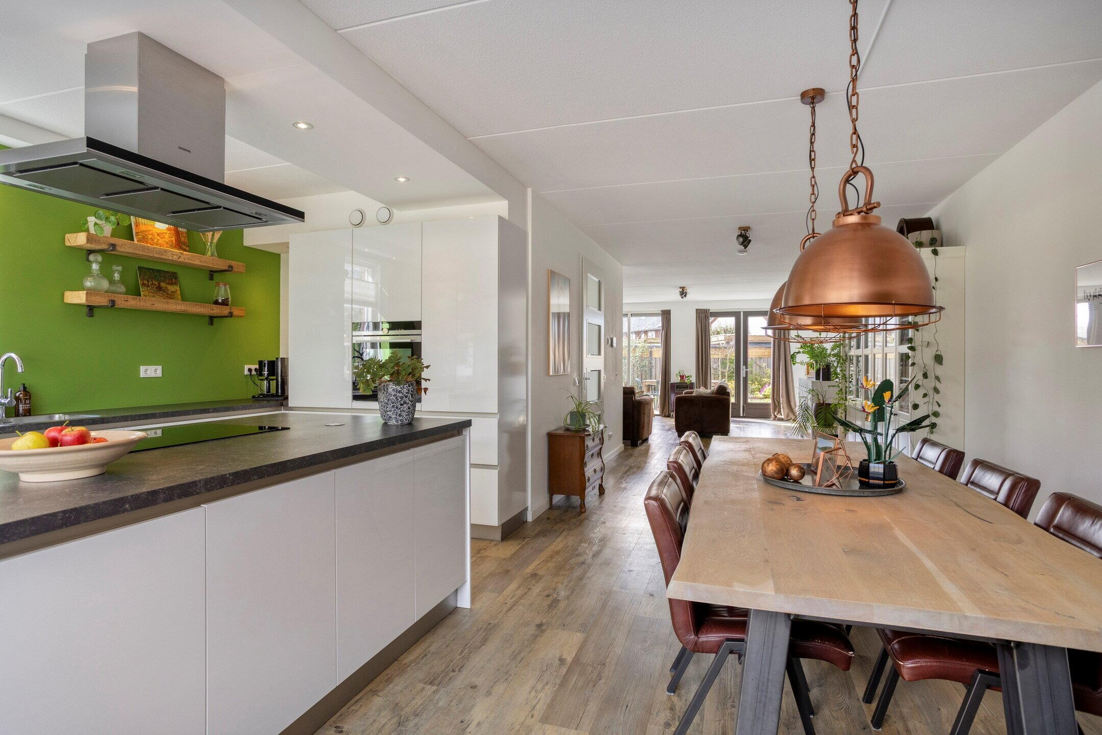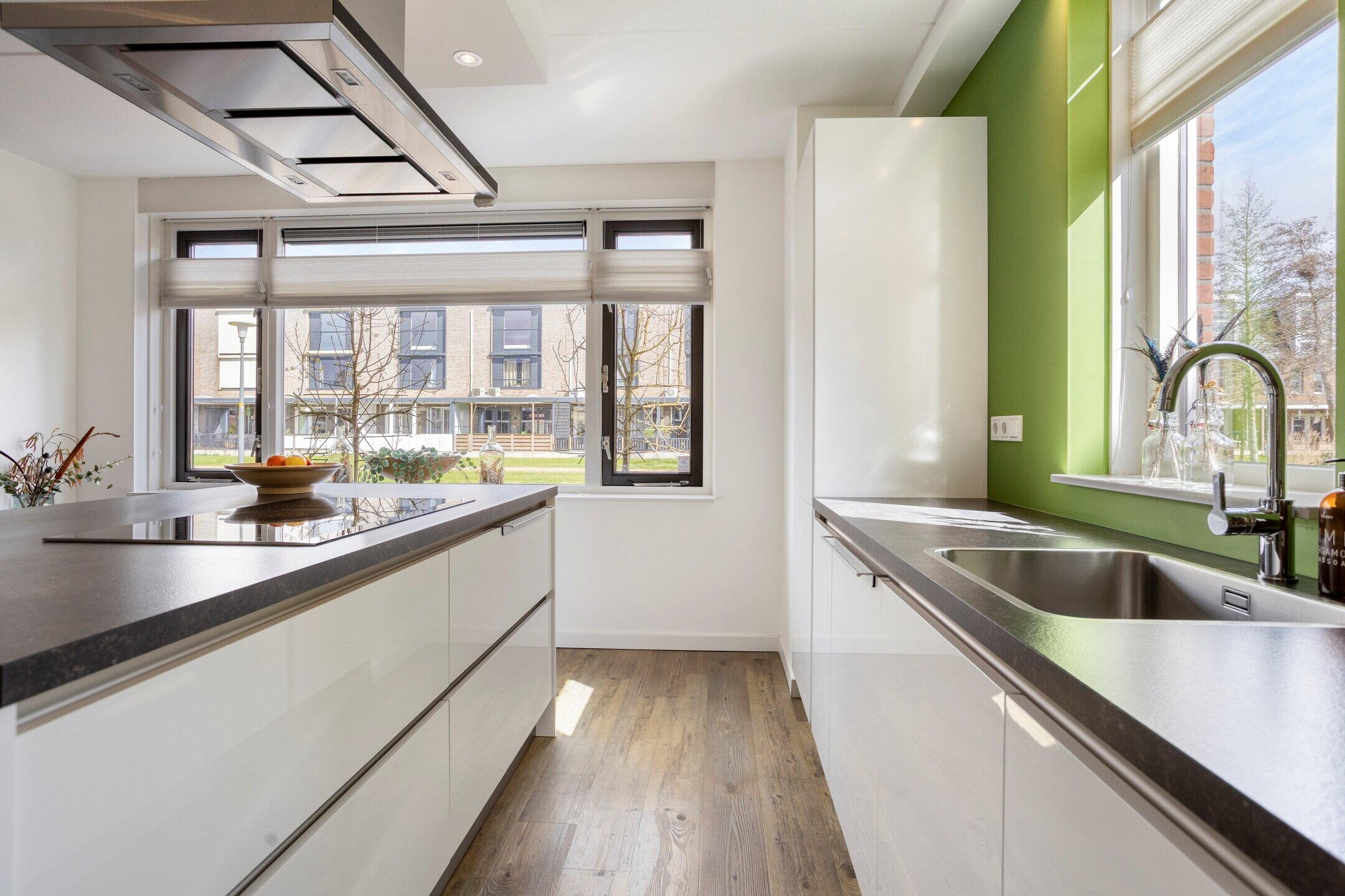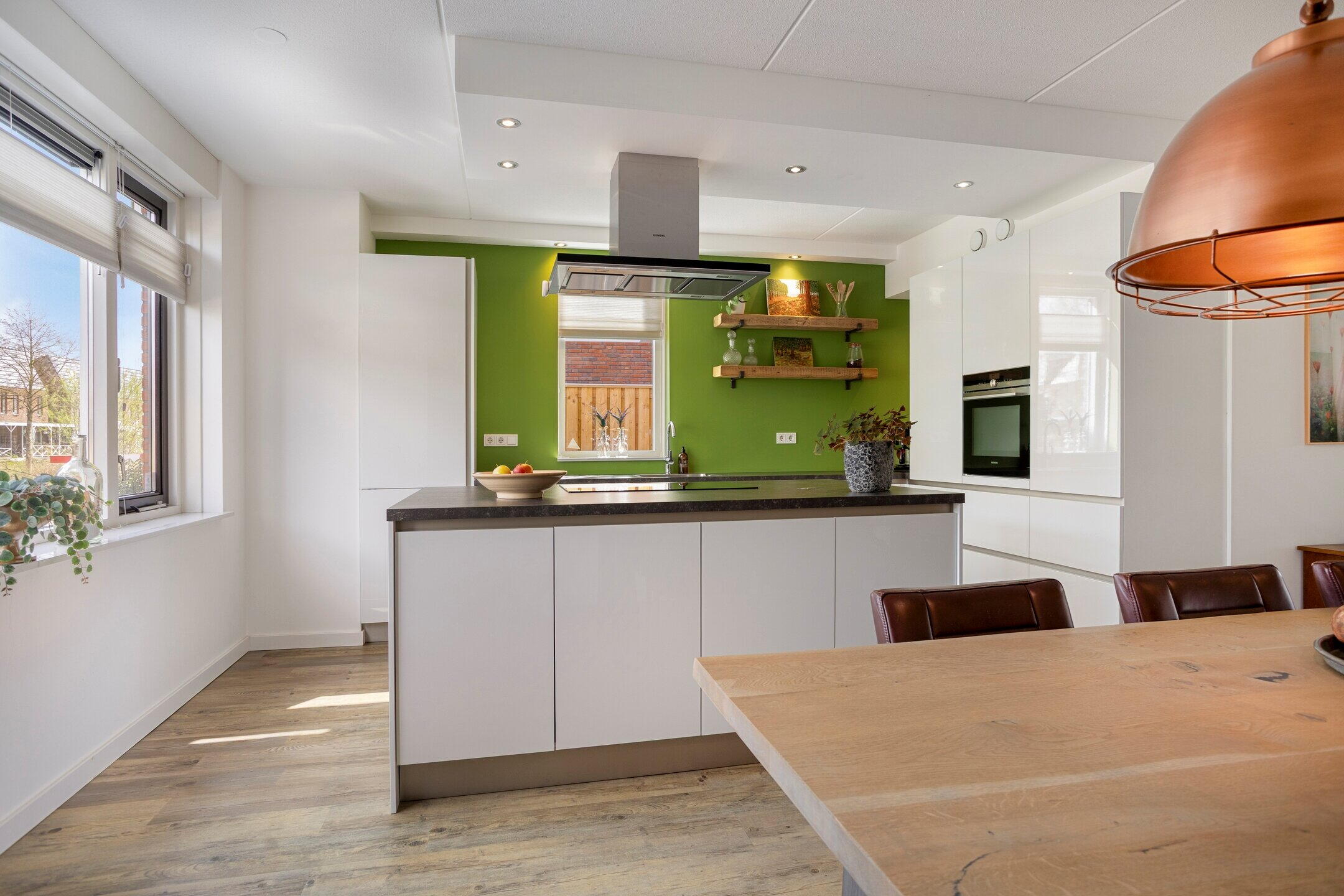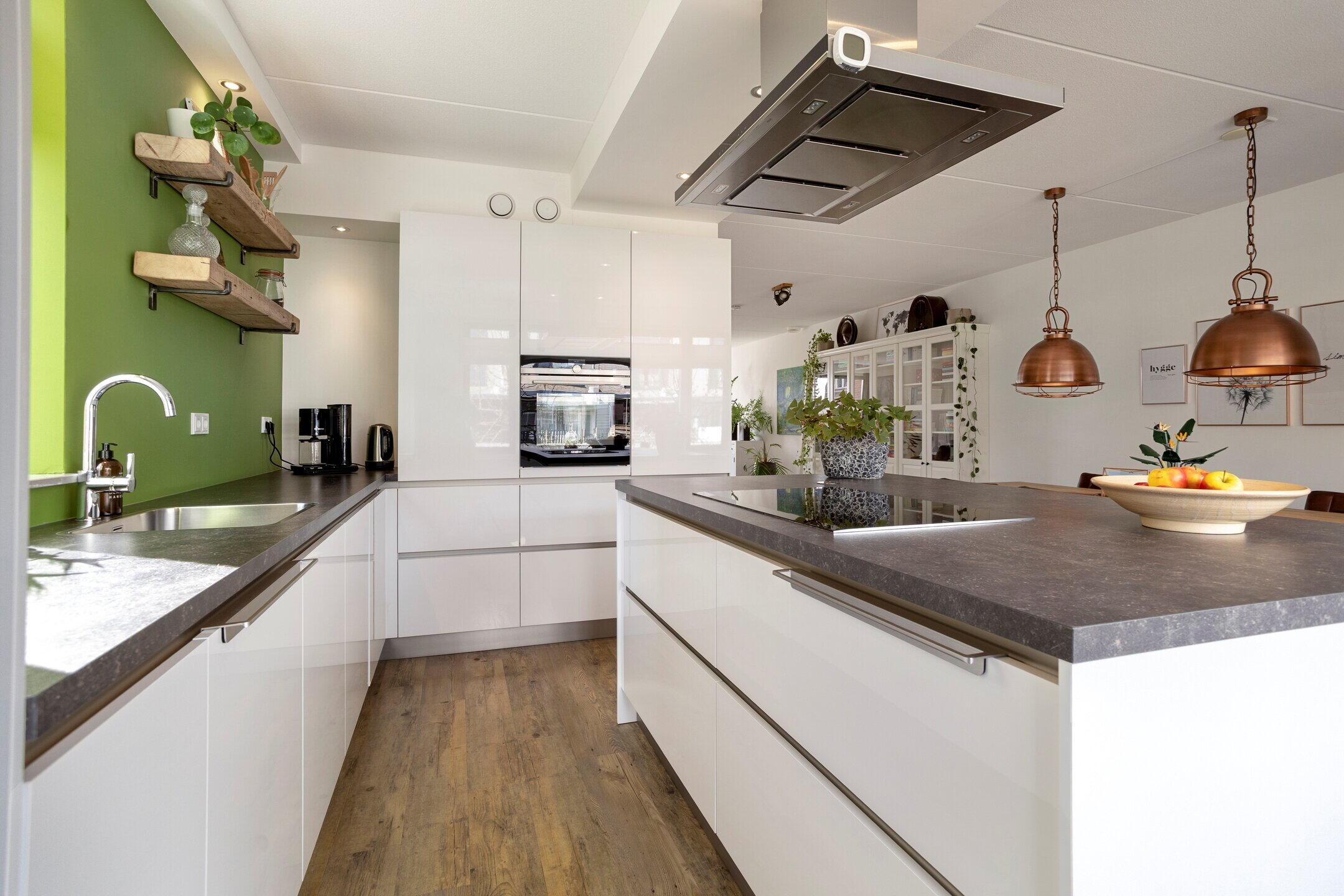 Aan de voorzijde van de woning bevindt zich de open keuken, die is uitgevoerd in een tijdloze combinatie van hoogglans witte fronten met een antraciet werkblad en voorzien van alle benodigde apparatuur oa. inductiekookplaat, afzuigkap, vaatwasser, oven met magnetronfunctie en koel-vriescombinatie. Het kookeiland vormt het centrale punt van de ruimte en maakt deze keuken niet alleen praktisch, maar ook bijzonder sfeervol. Er is volop werk- en bergruimte aanwezig, waardoor koken hier een waar plezier wordt. De benedenverdieping is afgewerkt met een warme houtlook pvcvloer met vloerverwarming.