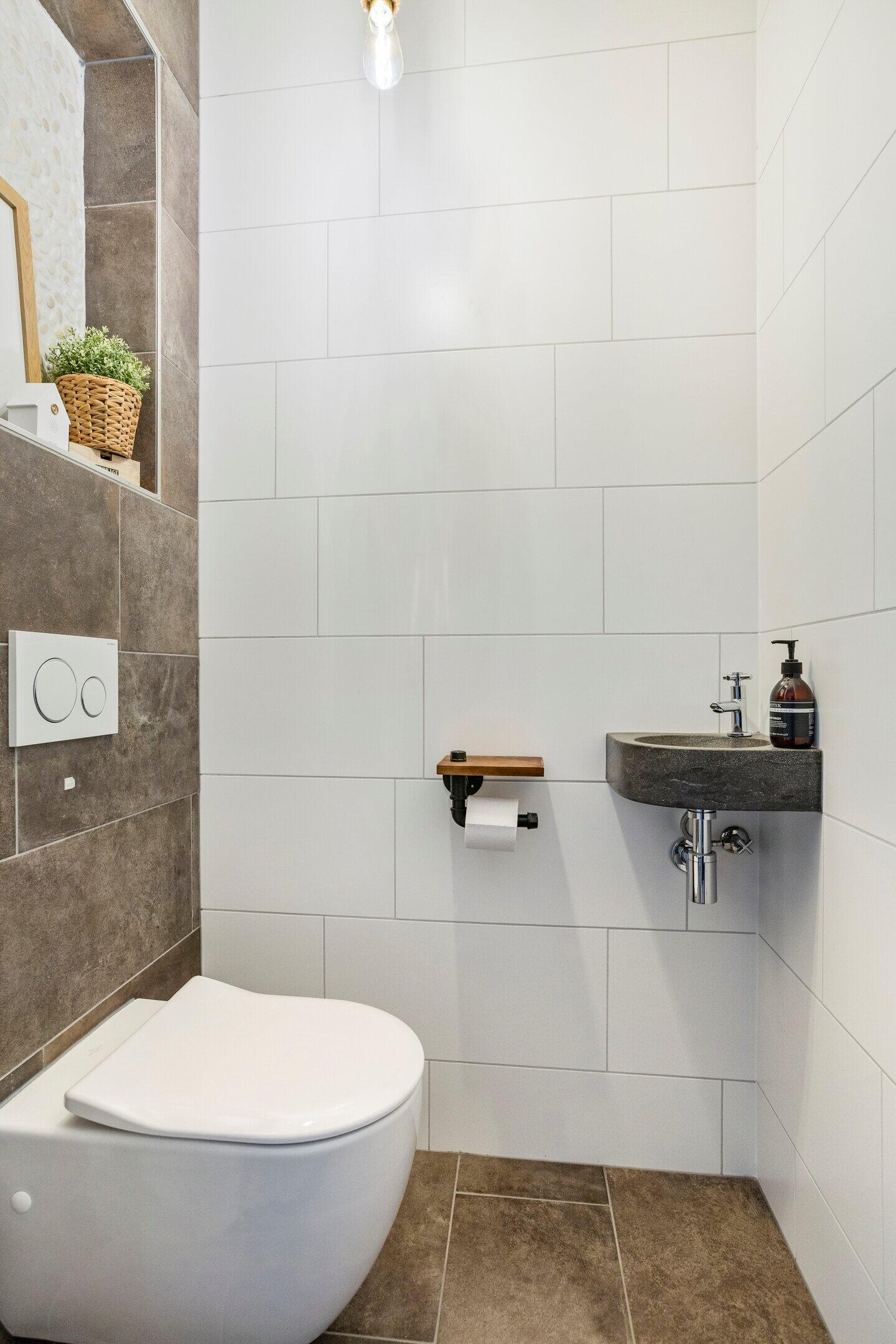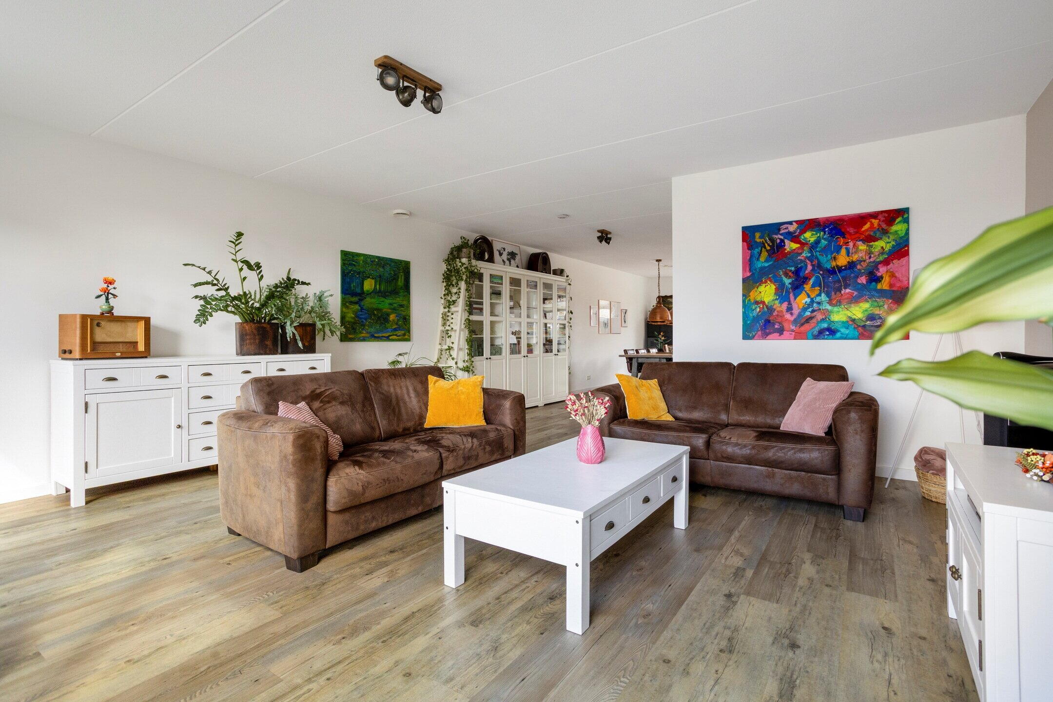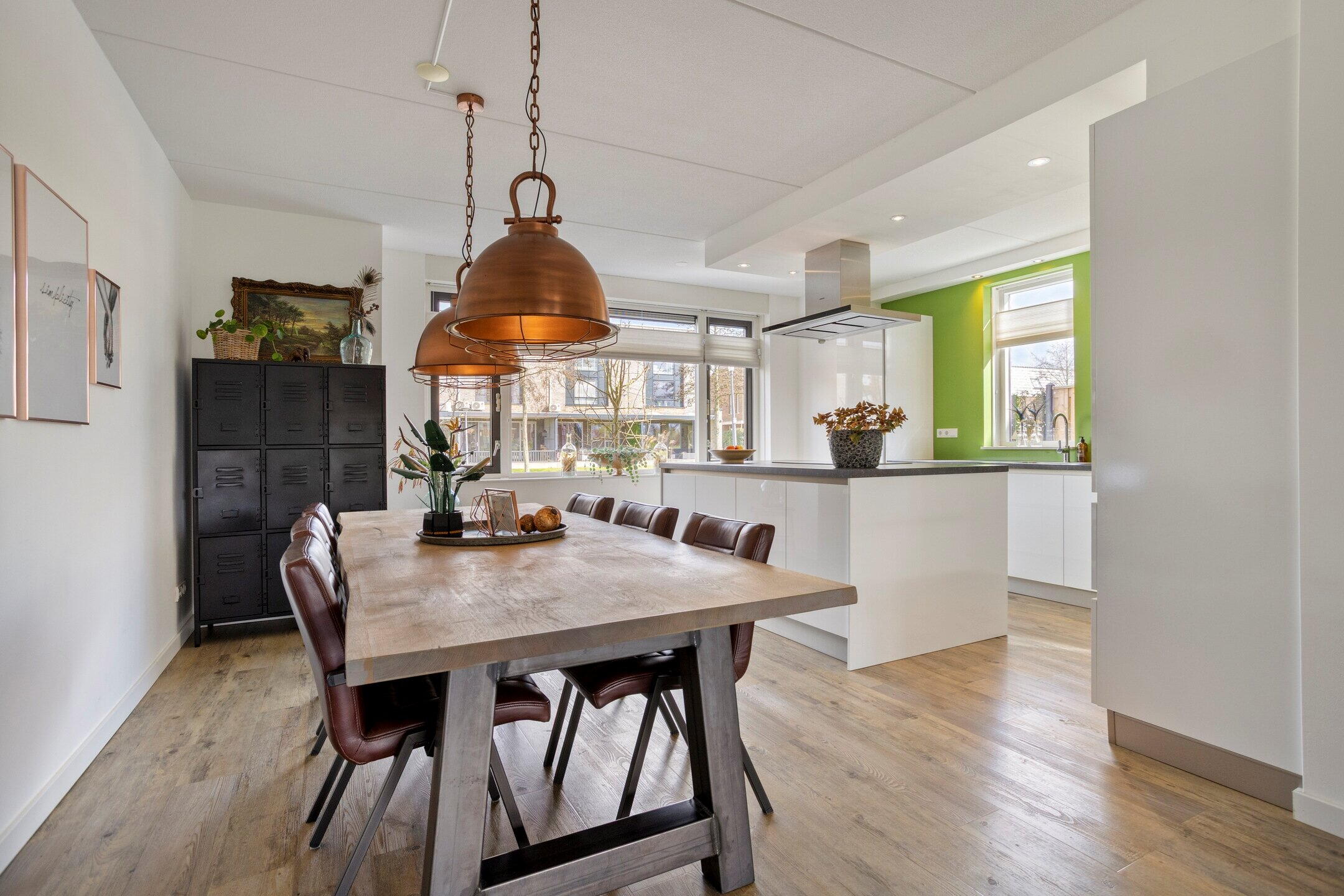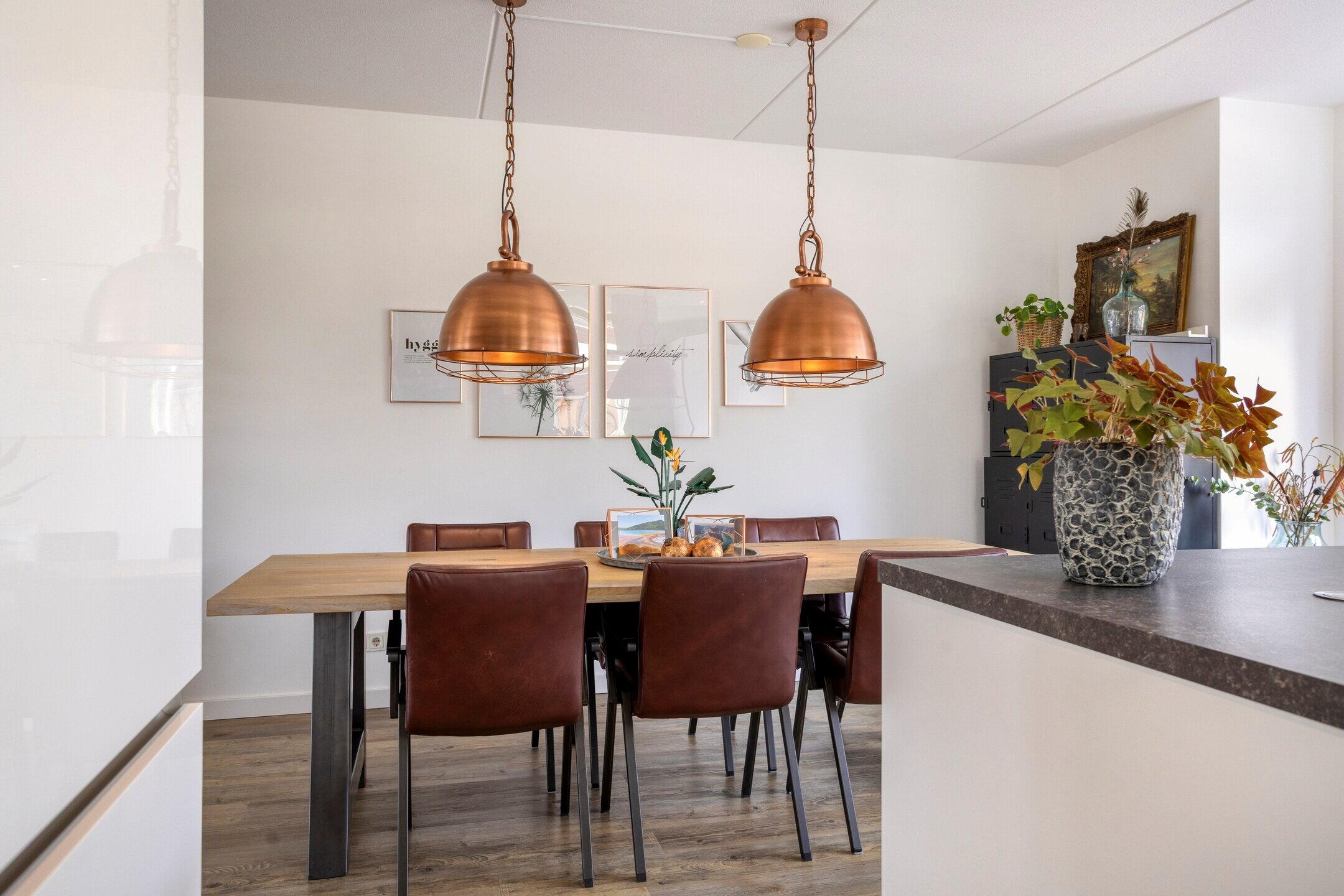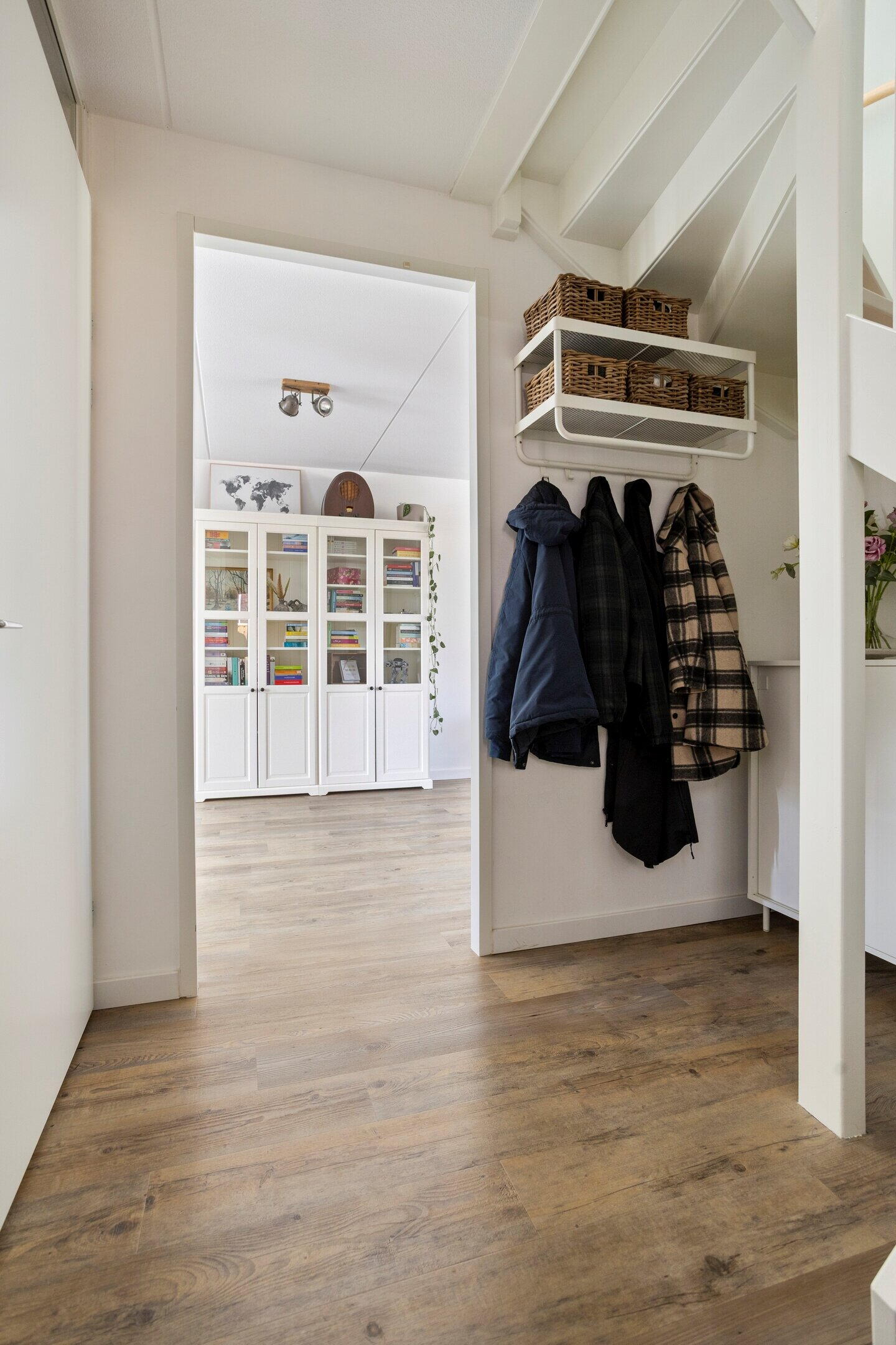 Aan de voorzijde van de woning bevindt zich de open keuken, die is uitgevoerd in een tijdloze combinatie van hoogglans witte fronten met een antraciet werkblad en voorzien van alle benodigde apparatuur oa. inductiekookplaat, afzuigkap, vaatwasser, oven met magnetronfunctie en koel-vriescombinatie. Het kookeiland vormt het centrale punt van de ruimte en maakt deze keuken niet alleen praktisch, maar ook bijzonder sfeervol. Er is volop werk- en bergruimte aanwezig, waardoor koken hier een waar plezier wordt. De benedenverdieping is afgewerkt met een warme houtlook pvcvloer met vloerverwarming.