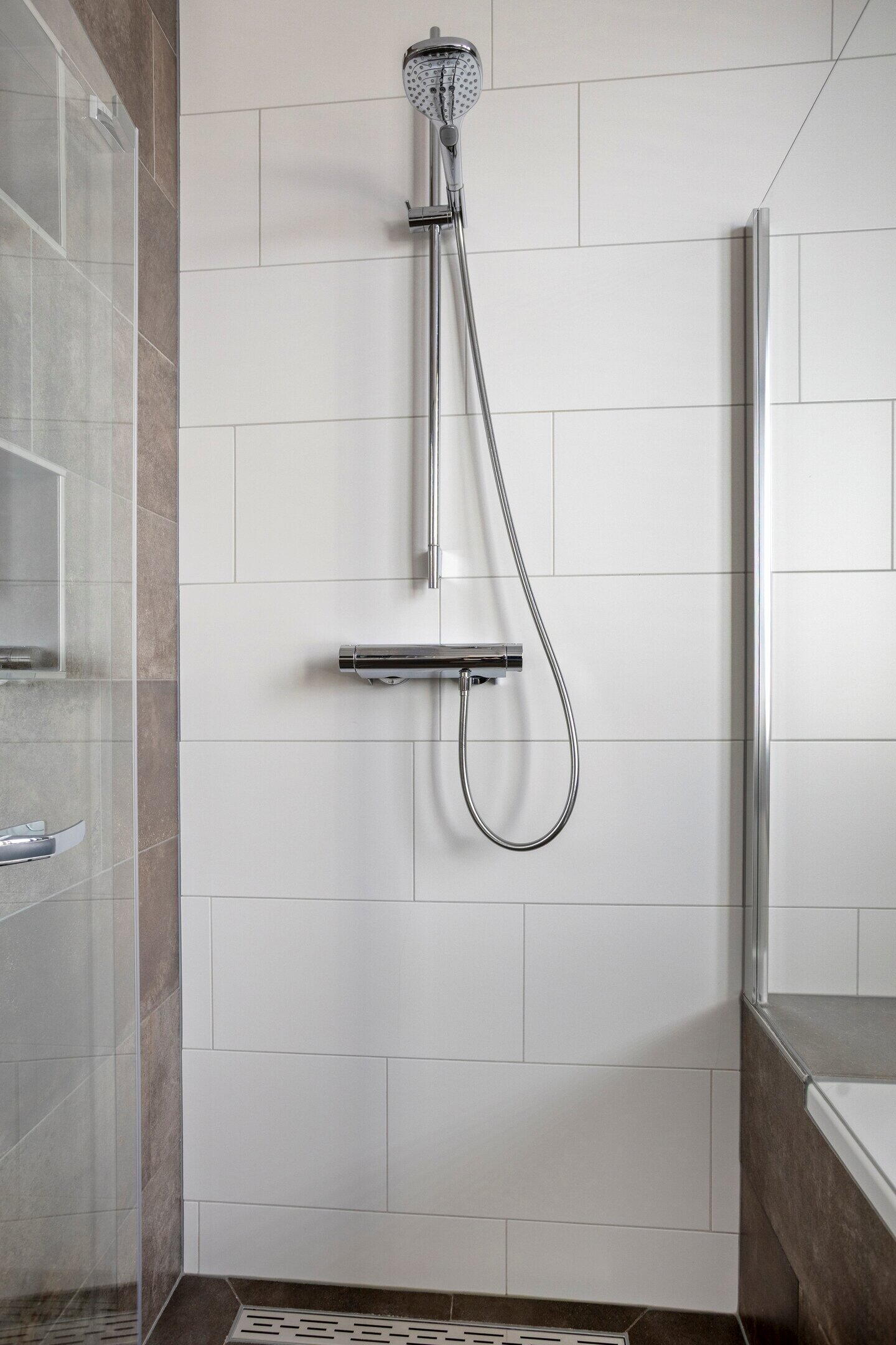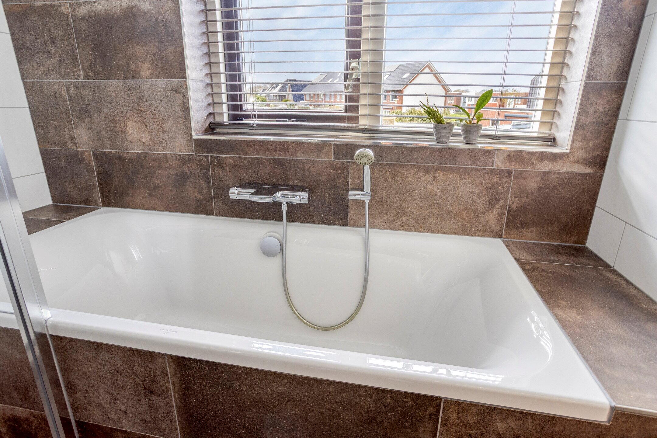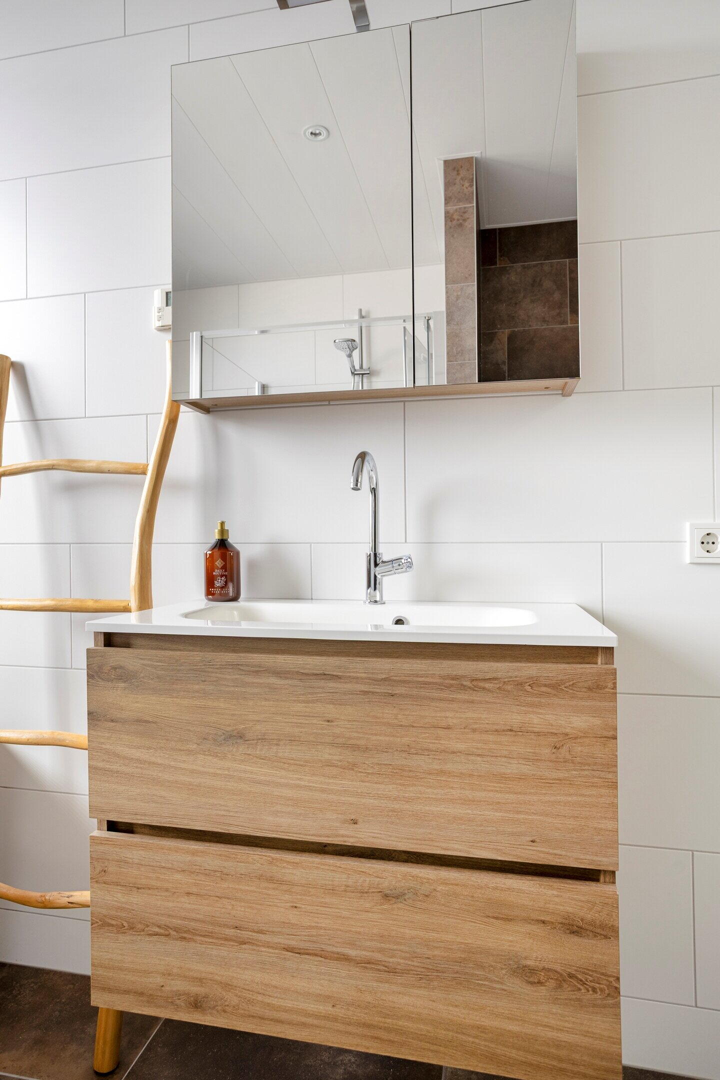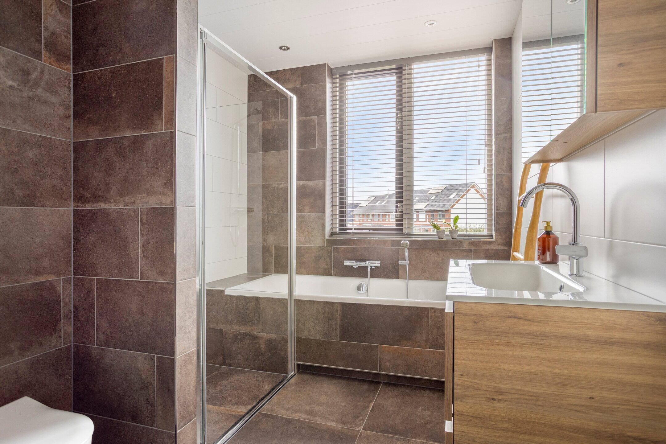- Ligbad, toilet, wasbak, wastafelmeubel, walk in douche, vloerverwarming